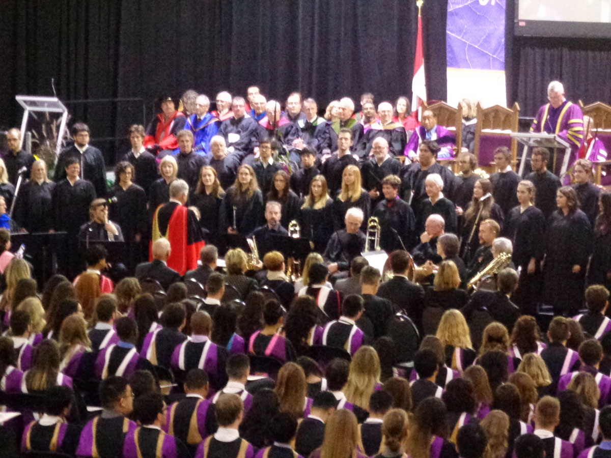 The WLU Alumni Choir joined the University Choir to sing at the 2016 installation of WLU Alumni Choir member Eileen Mercier as Chancellor at spring convocation, with Professor Lee Willingham conducting. Ms. Mercier came down and joined the choir when they sang. This convocation also marked the retirement of former Laurier President Max Blouw.